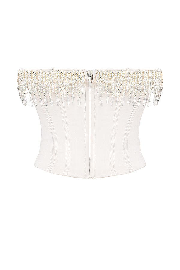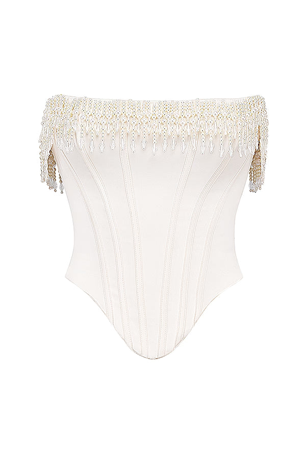 Bu straplez korse body, üst kısmındaki inci işlemeleriyle zarif ve gösterişli bir hava yaratıyor. Vücuda tam oturan korsaj detayı, feminen siluetinizi ön plana çıkarırken özel davetlerden gece şıklığına kadar güçlü bir stil sunar.