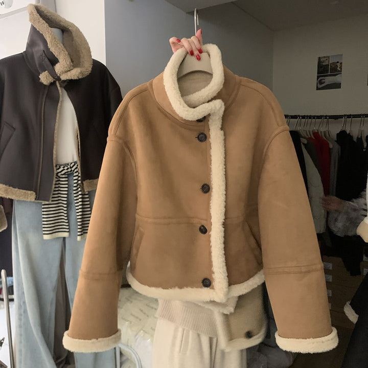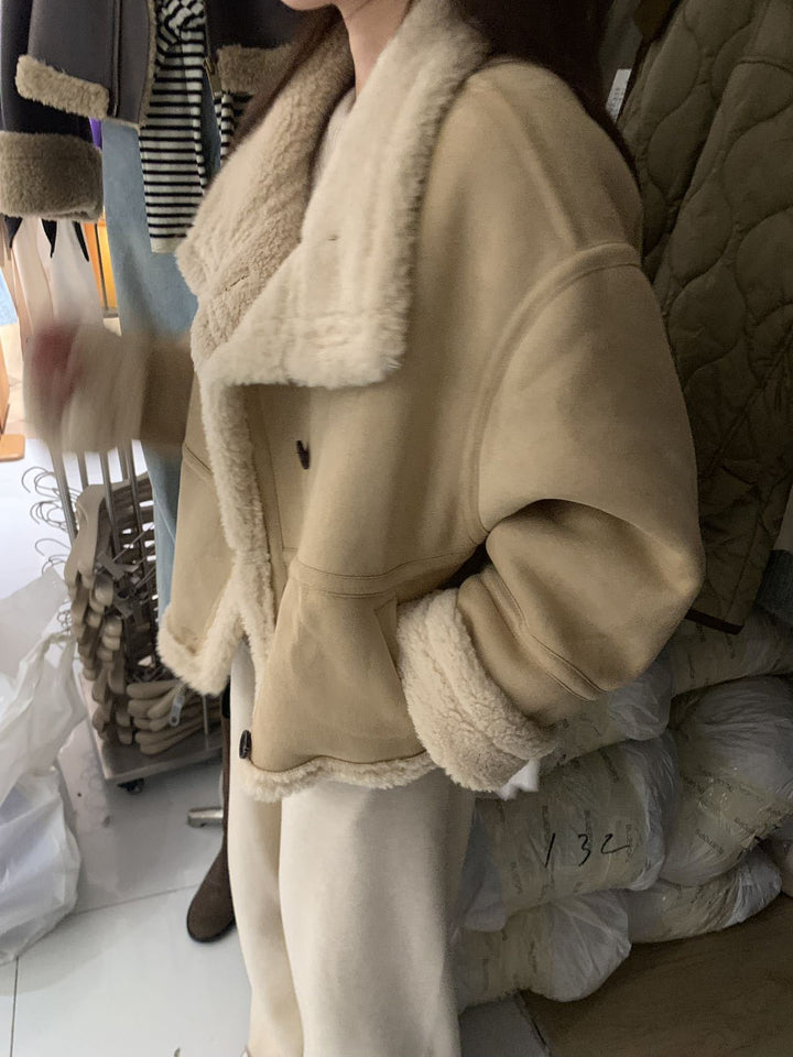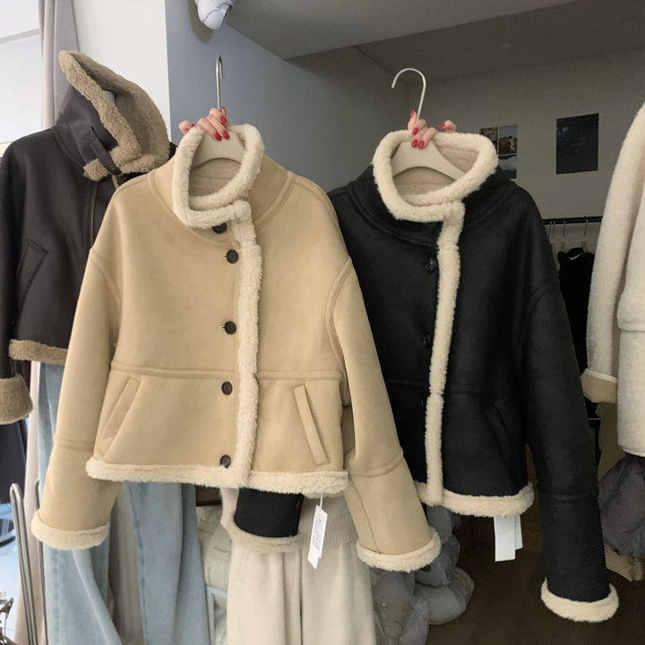 Detay: Düğmeli kapanış, kontrast kürk detaylı tasarım