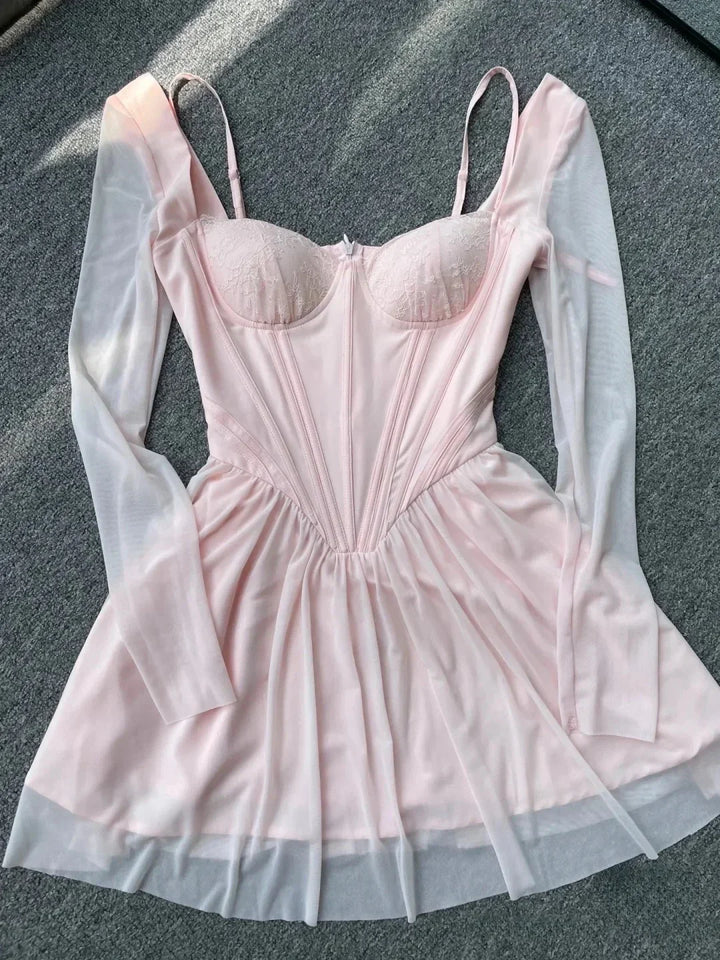 Romantik ve feminen detaylarıyla dikkat çeken pudra korsaj mini elbise, transparan tül kolları ve korsajlı üst tasarımıyla zarif bir görünüm sunuyor. Hafif kabarık etek formu, genç ve enerjik bir hava katarken, özel davetlerden şık akşam yemeklerine kadar her ortamda göz alıcı bir seçenek oluşturuyor. Modern prenses esintisiyle tasarlanan bu elbise, feminen tarzını öne çıkarmak isteyenler için kusursuz bir tercih.