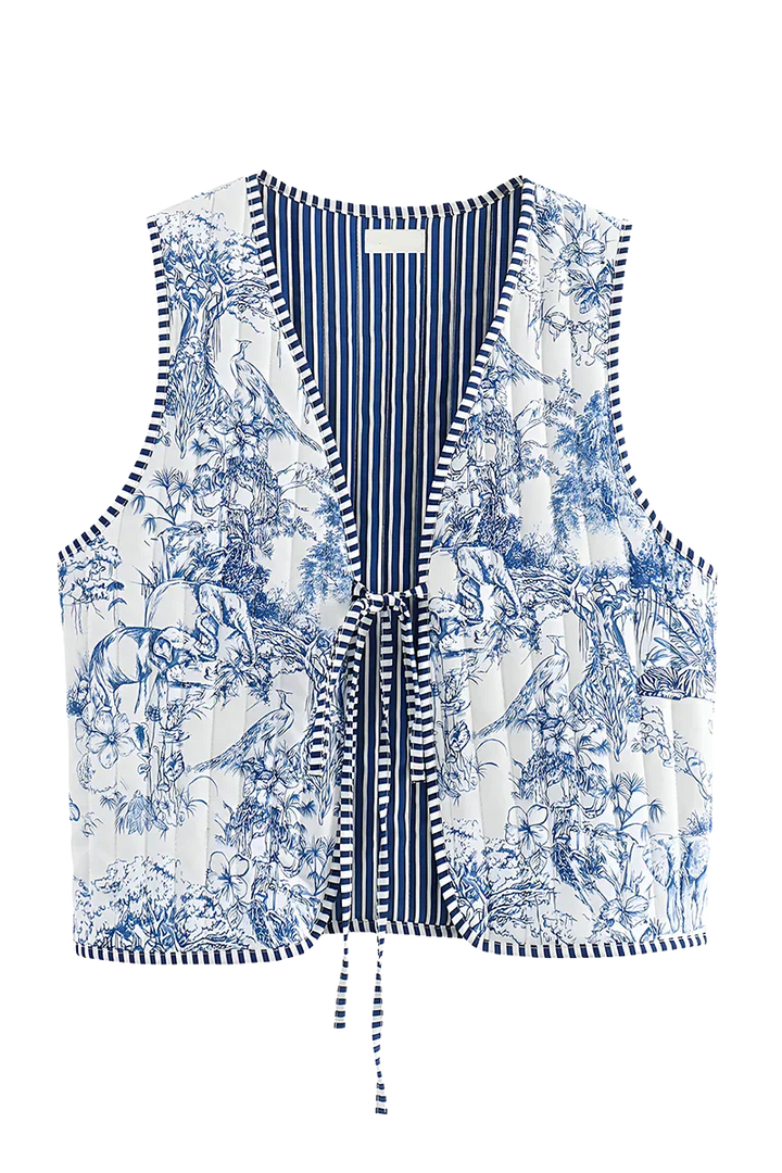 Vintage esintiler taşıyan bu desenli yelek, mavi-beyaz pastoral motifleri ve iç kısmındaki çizgili astarıyla çift yönlü bir şıklık sunuyor. Bağlamalı ön detayı sayesinde hem rahat hem feminen bir hava katar. Jean, basic bluz ya da elbiselerle kombinlenerek modern ve özgün bir stil yaratır.