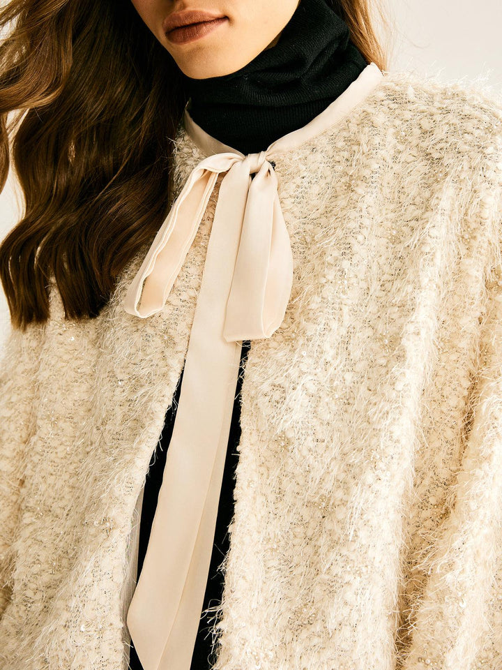 Yumuşak dokusu ve şık bağcık detayıyla dikkat çeken bu tüylü krem panço, zarif ve sıcak bir görünüm sunuyor. Soğuk havalarda şıklığınızı tamamlayacak rahat ve stil sahibi bir seçim!