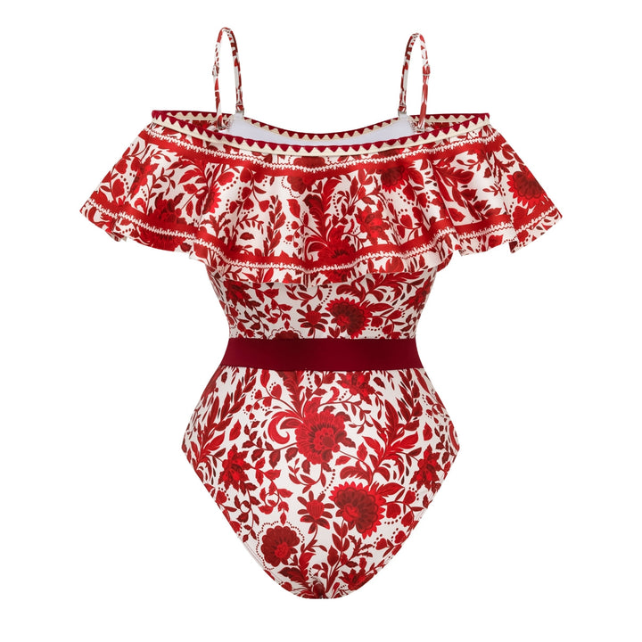 Bandeau Fırfırlı Kırmızı Çiçek Silueti Mayo-Pareo