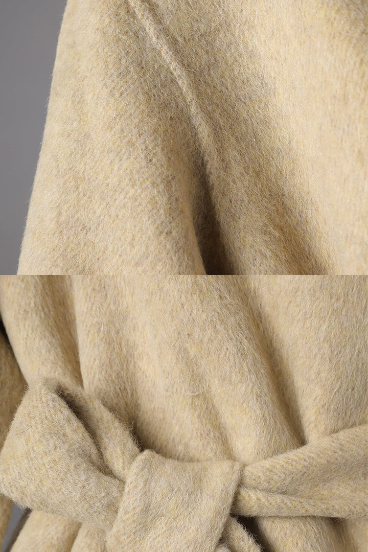 Modern ve zarif çizgilere sahip bu bej mini kaban, yüksek yaka tasarımı ve tek düğmeli kapamasıyla sofistike bir duruş sunar. Rahat düşük omuz kesimi ve geniş kollar, tasarıma modern bir siluet katarken, uyumlu kuşak detayı belinizi vurgulayarak feminen bir görünüm sağlar. Yumuşak ve sıcak tutan yün karışımlı kumaşıyla hem şıklığı hem de konforu bir arada sunar.