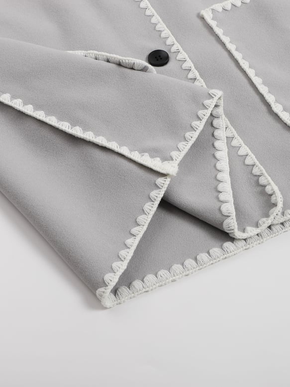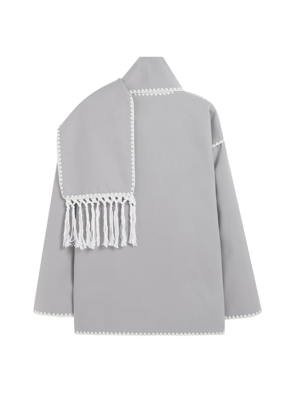 Şal detaylı, püskül işlemeli kısa kaban – kontrast biyeleriyle modern ve farklı bir stil dokunuşu.