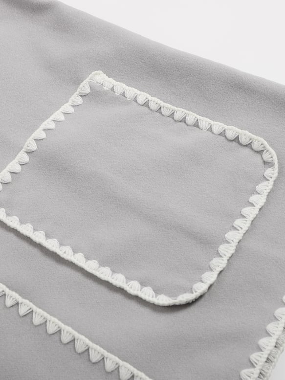 Detay: Püsküllü şal, beyaz biye süslemeler, rahat kesim