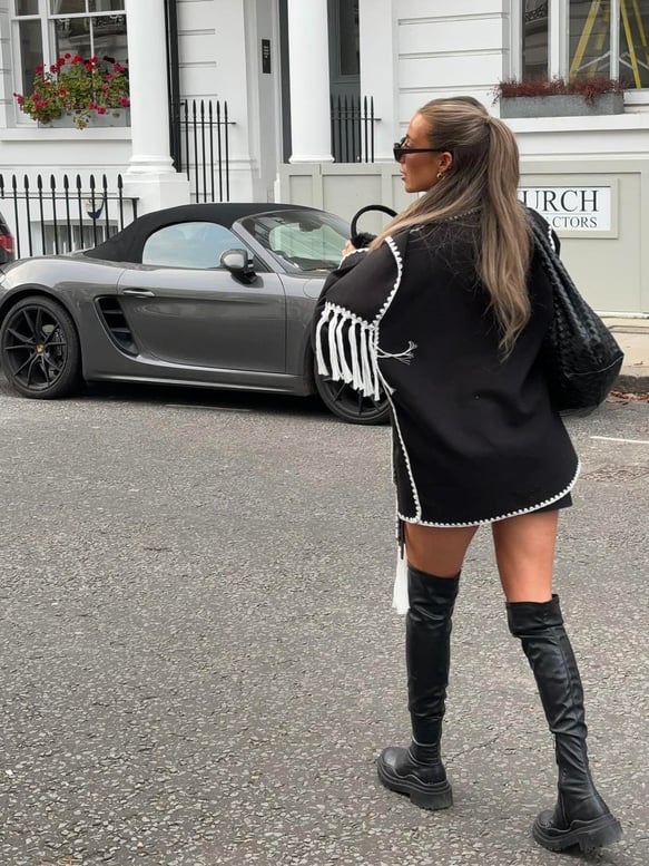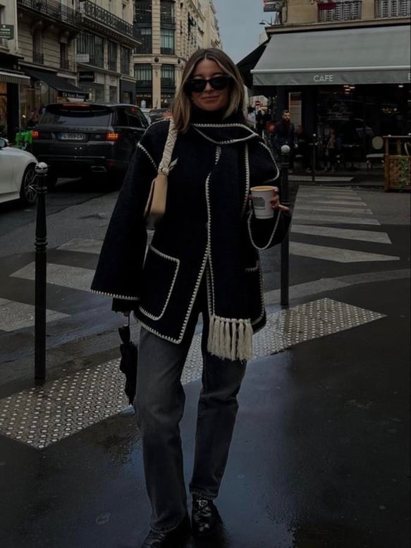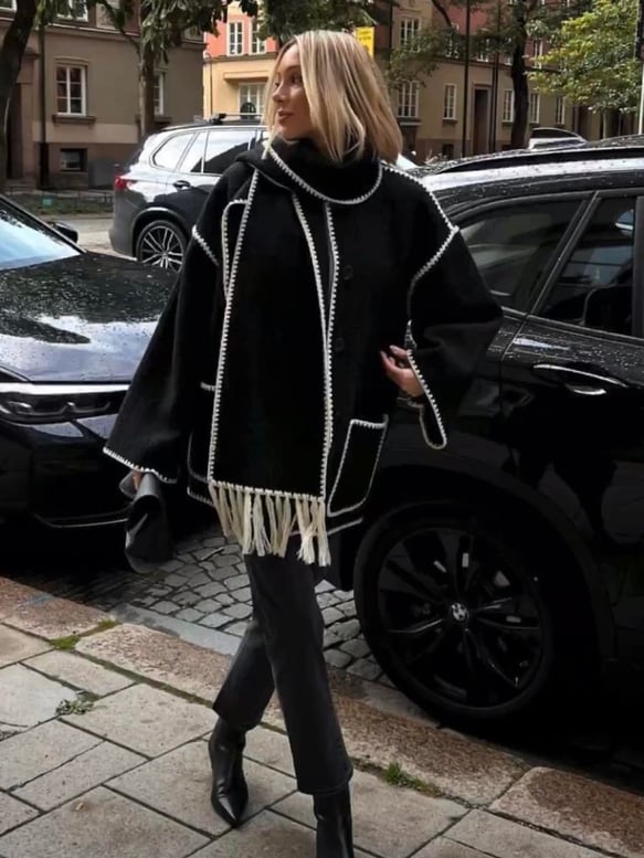 Oversize kesim, kontrast dikişli püskül detaylı kaban.