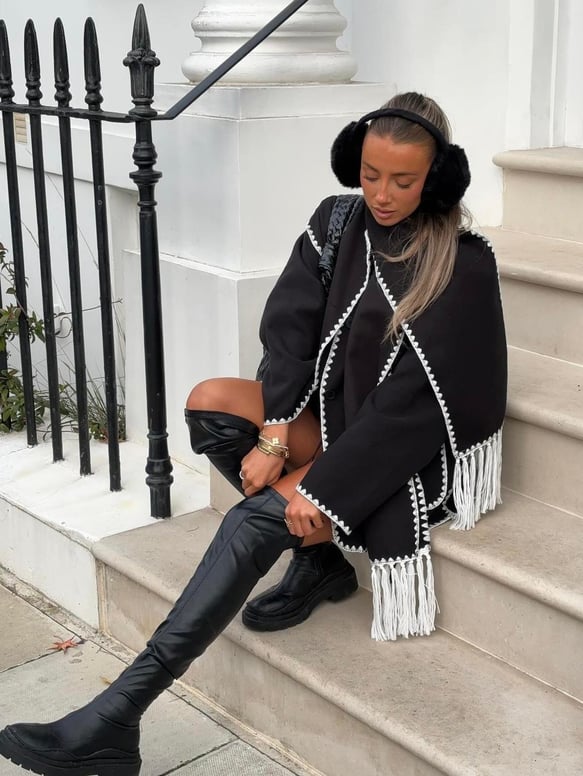 Konforlu duruşu ve dikkat çekici detaylarıyla öne çıkan bu siyah kaban, farklı dokunuşlarla kış stilini modernleştiriyor. Oversize formu sayesinde rahat bir kullanım sunarken, beyaz biye dikişler ve püskül detayları tasarıma dinamik bir hava katıyor. Şehir şıklığını bozmadan öne çıkmak isteyenler için ideal bir seçim.
