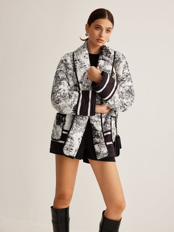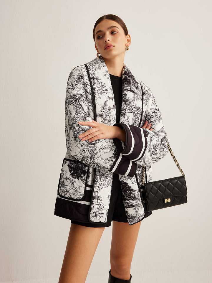 Sanatsal desenleriyle öne çıkan bu kuşaklı oversize mont, modern bir görünümü sofistike bir dokunuşla birleştiriyor. Geniş formu rahatlık sağlarken, kuşak detayı bedeni zarifçe sarmalıyor. Siyah ve beyaz kontrast desenleri, stilinizi her ortamda dikkat çekici hale getiriyor. Hem günlük kombinlerde hem de akşam şıklığında vazgeçilmez bir parça olacak.