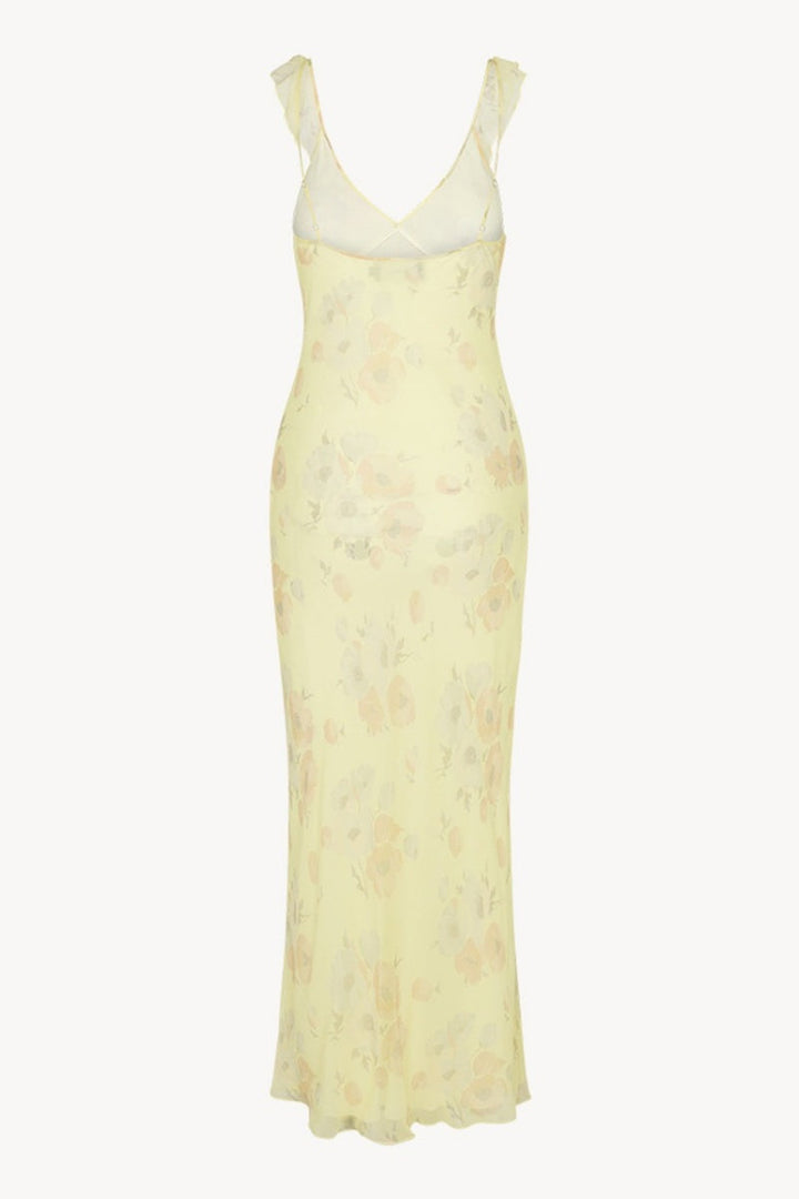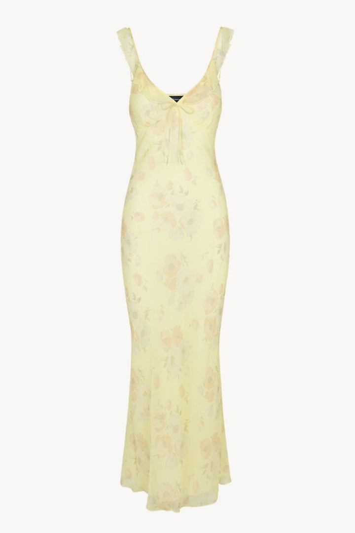 Fiyonklu Volanlı Derin Yakalı Çiçekli Slim Fit Uzun Elbise