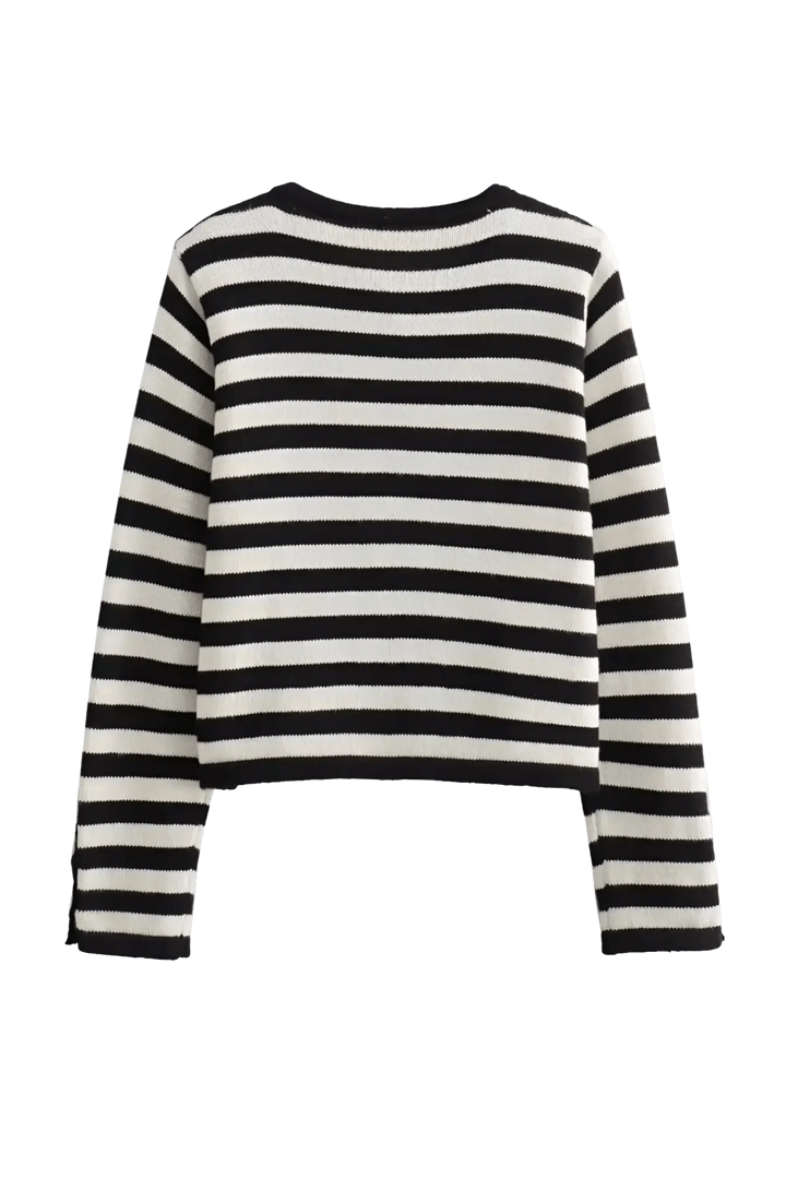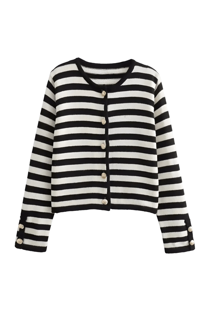 Sonbaharın yeni ürünümüzle tanışın: Chanel'den ilham alan klasik görünümü bünyesinde barındıran bedene oturan, şık çizgili örgü hırka. Bu yakasız kısa kazak, kıyafetinize sofistike bir dokunuş katan zarif dekoratif düğmelere sahiptir.