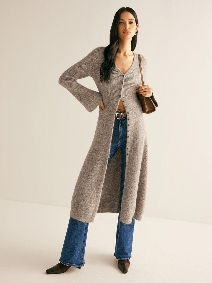 Minimal tasarımı ve rahat dokusuyla gardırobunuzun vazgeçilmezi olacak uzun gri hırka. Düğme detayları ve geniş kesim kollarıyla günlük stilinize zarif bir dokunuş katın. Hem şıklık hem de konfor bir arada!