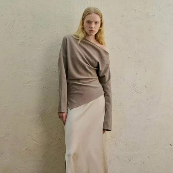 Asimetrik omuz detayıyla fark yaratan, fit kesimli triko bluz – cesur ve feminen çizgiyi öne çıkaran modern bir tasarım.