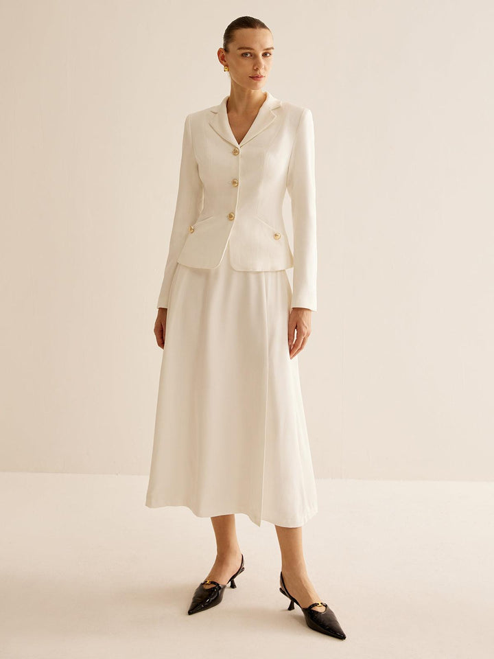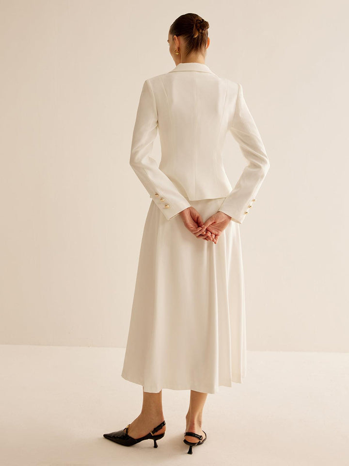 Zarif tasarımı ve altın düğme detaylarıyla öne çıkan ekru blazer ceket, sofistike ve şık bir görünüm sunar. Özel davetlerde ve iş kombinlerinde kusursuz bir seçim!