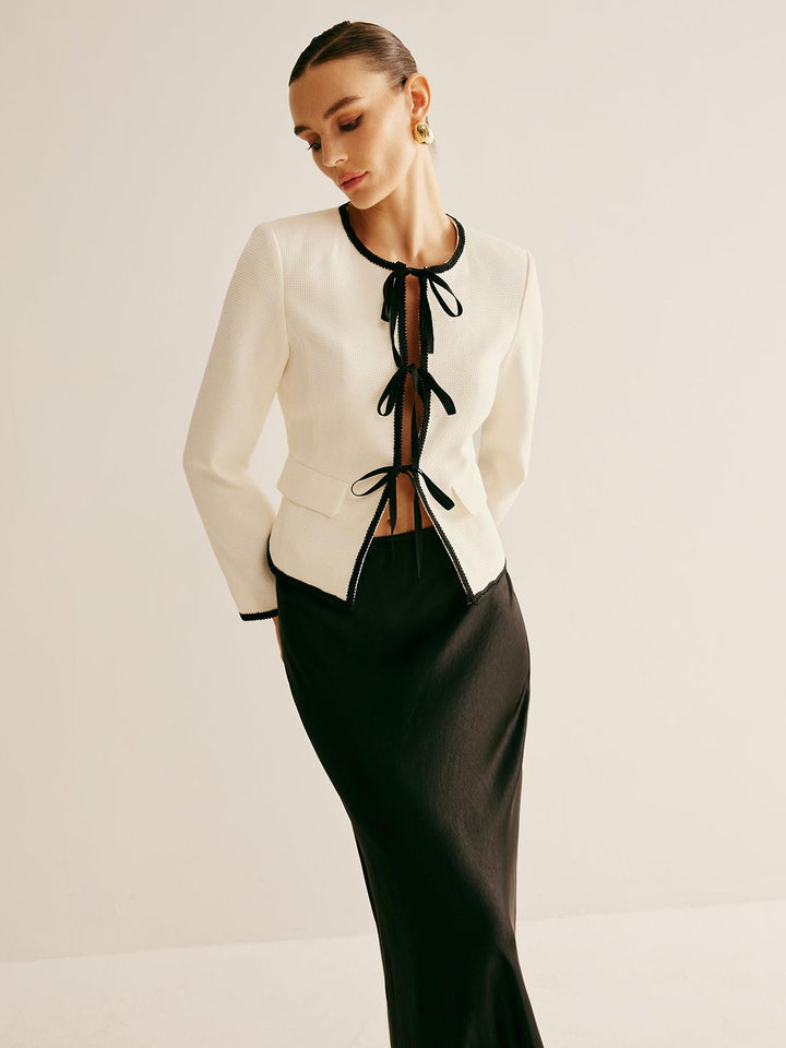 Zarif tasarımı ve siyah kurdele detaylarıyla öne çıkan ekru blazer ceket, feminen ve sofistike bir stil sunar. Özel kombinlerinizi tamamlamak için ideal bir parça!