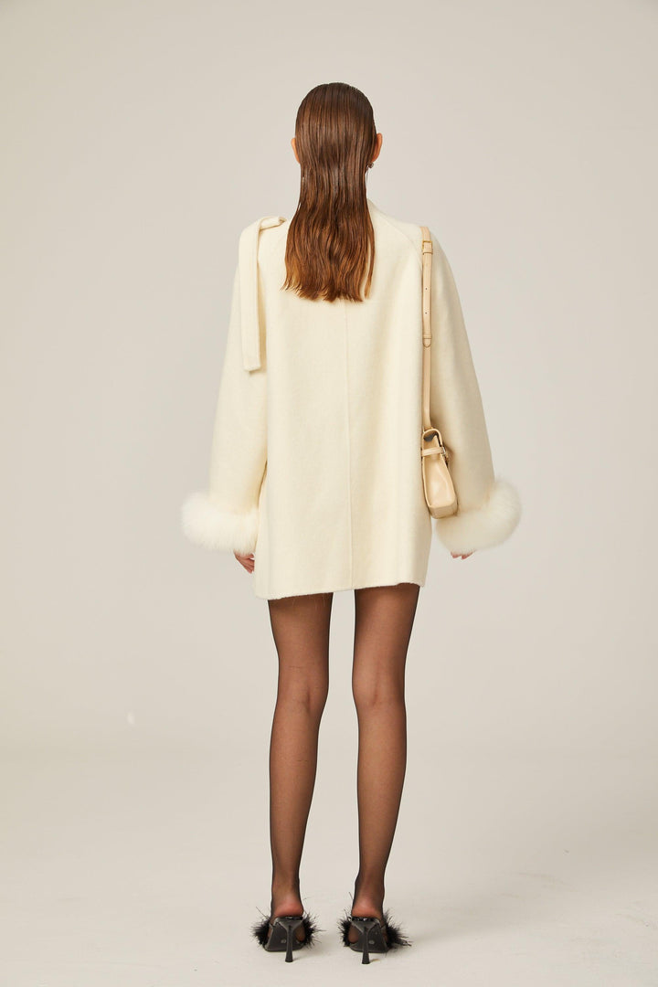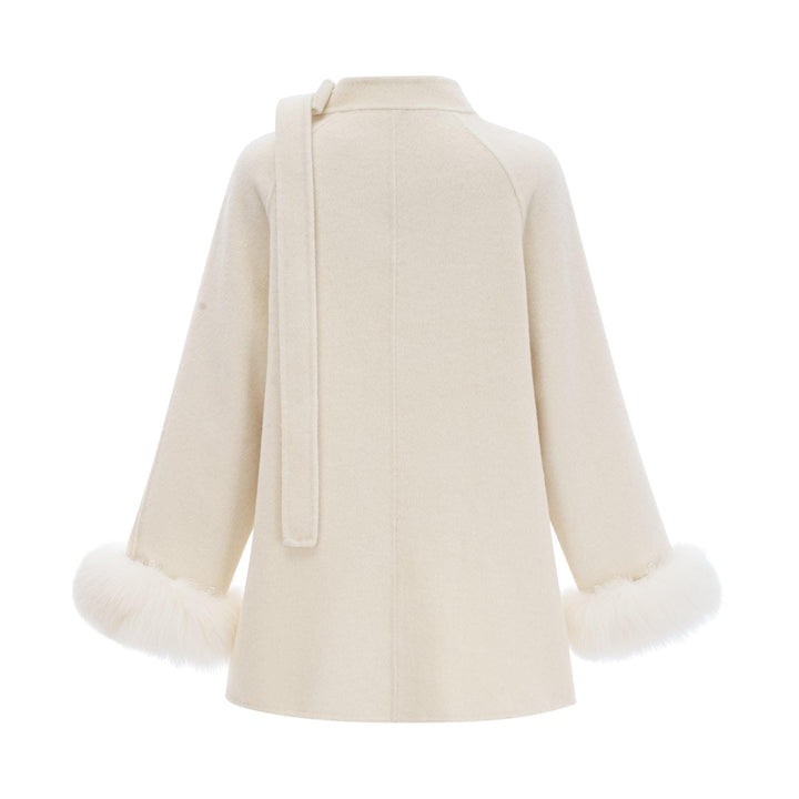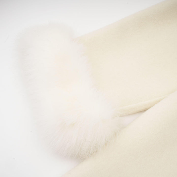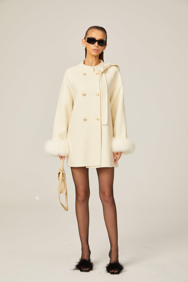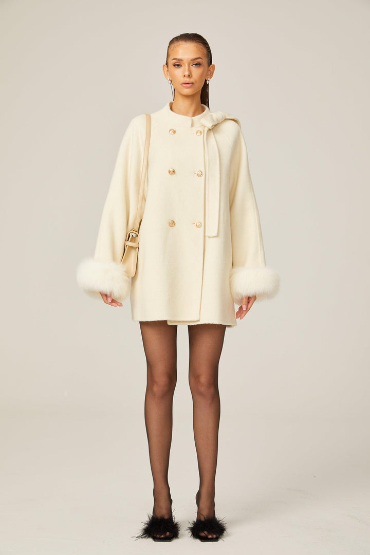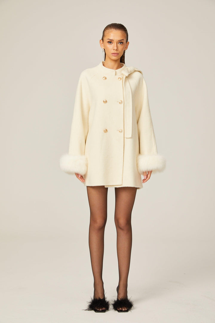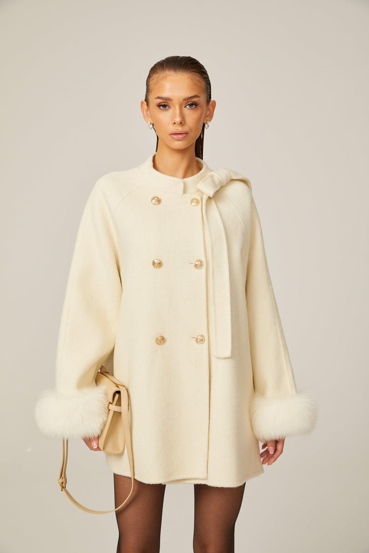"Elegant Charm" kaban, şıklık ve zarafeti bir araya getiriyor. Yumuşak dokulu krem rengi kumaşı, altın detaylı düğmeleri ve kürk manşetleriyle kış sezonunda tarzınızı bir üst seviyeye taşıyın. Özel davetlerden günlük kullanıma kadar her ortam için mükemmel bir seçim!