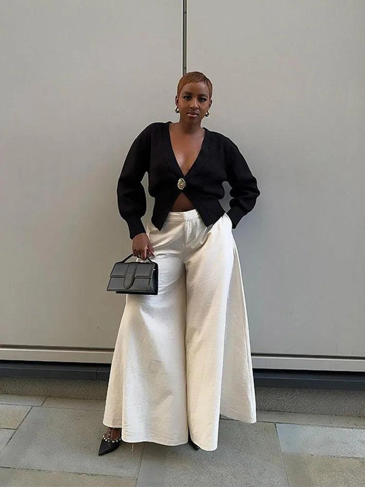 Bu sofistike V yaka hırka, minimalizmi zarafetle birleştiriyor. Altın rengi düğmesi ve rahat kesimi ile yüksek ama zahmetsiz bir görünüm için mükemmel bir seçimdir. Zamansız bir stil için etek veya pantolonla eşleştirin.