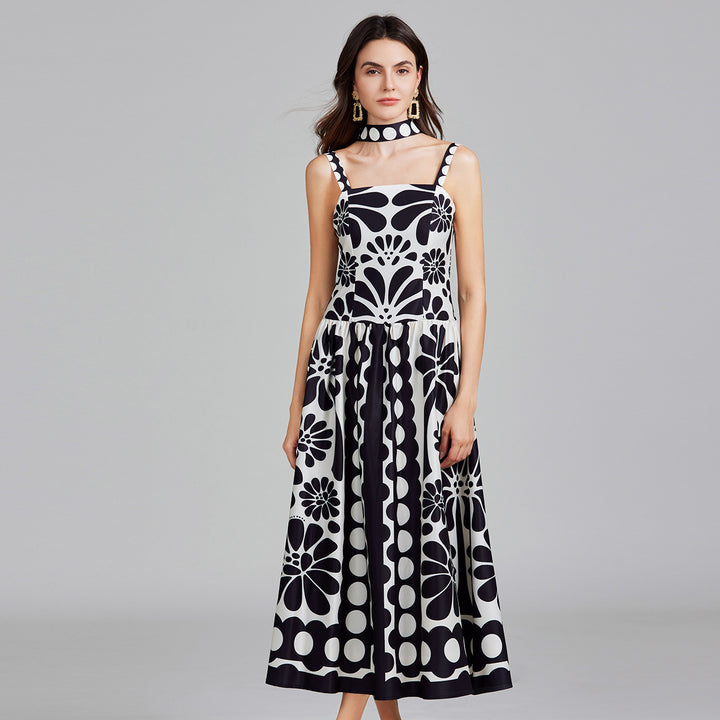 Elisabeth Çiçekli Spagetti Uzun Siyah Elbise
