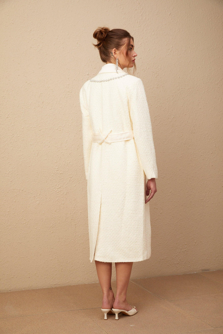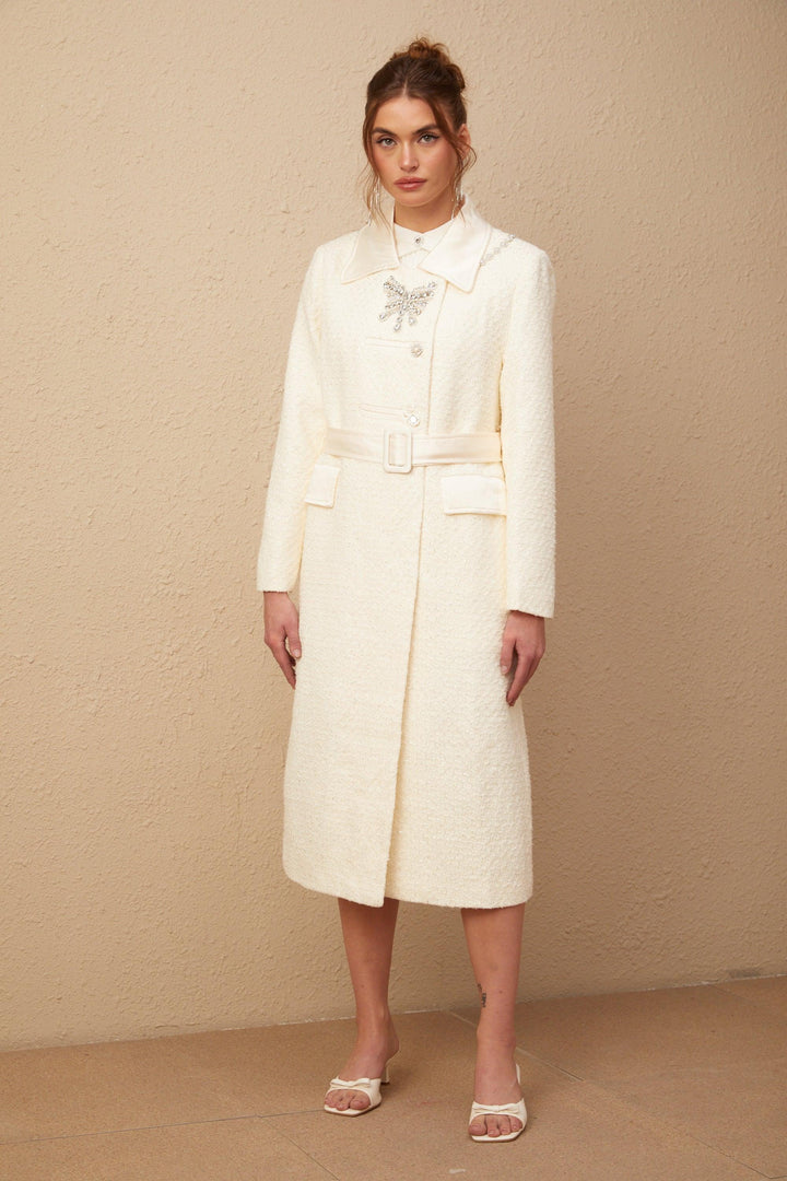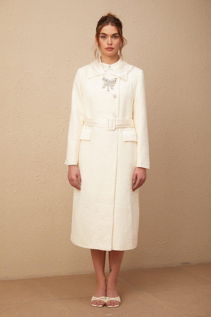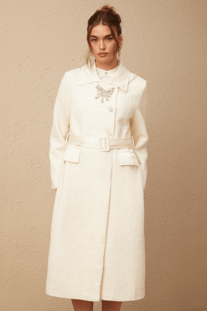 "Eternal Grace" kaban, zarif beyaz dokusu, ince kuşak detayı ve göz alıcı taş işlemeleriyle kış şıklığınıza sofistike bir dokunuş katıyor. Modern silueti ve zarif tasarımıyla özel davetlerden günlük kullanıma kadar her ortamda stilinizi tamamlar.