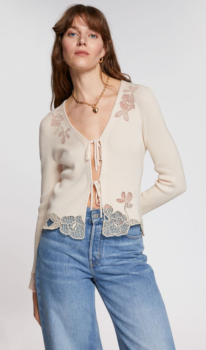 Dantel detayları ve bağcık kapamasıyla feminen dokunuşu vurgulayan modern hırka modeli.