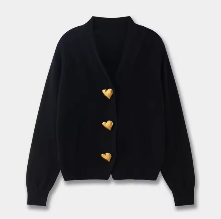 Romantik detaylarıyla öne çıkan bu hırka, kalp formundaki düğmeleriyle zarif bir şıklık sunuyor. Yumuşak dokusuyla hem günlük hem de şık kombinlerinizde rahatlıkla tercih edebilirsiniz.