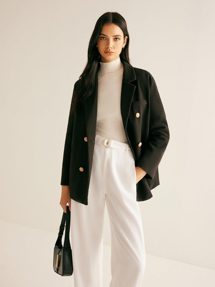 - Altın Detaylı Çift Düğme Tasarımı: Ceketin şıklığını ön plana çıkaran altın düğmeler.