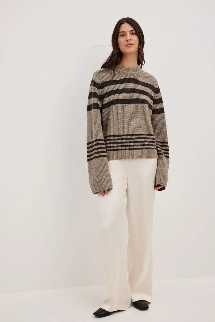 Rahatlığın ve şıklığın birleşimi olan bu çizgili triko kazak, salaş kesimi ve sıcak tutan dokusuyla günlük stilinize modern bir hava katar. Minimal çizgi detaylarıyla zamansız bir görünüm sunarken, soft renk tonları sayesinde her kombine kolayca uyum sağlar.