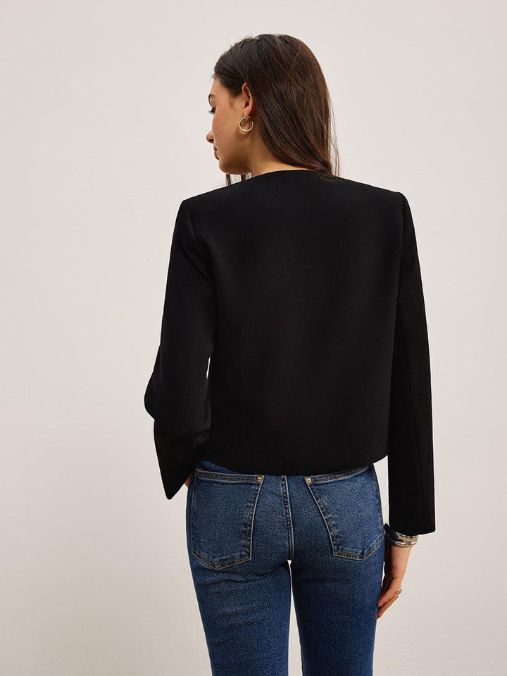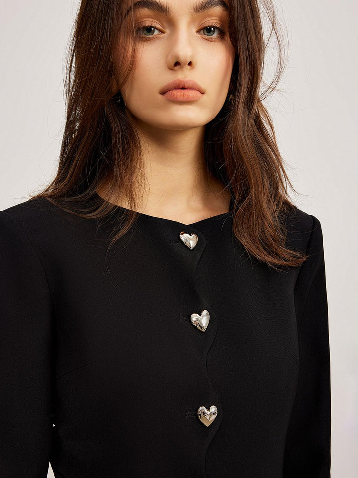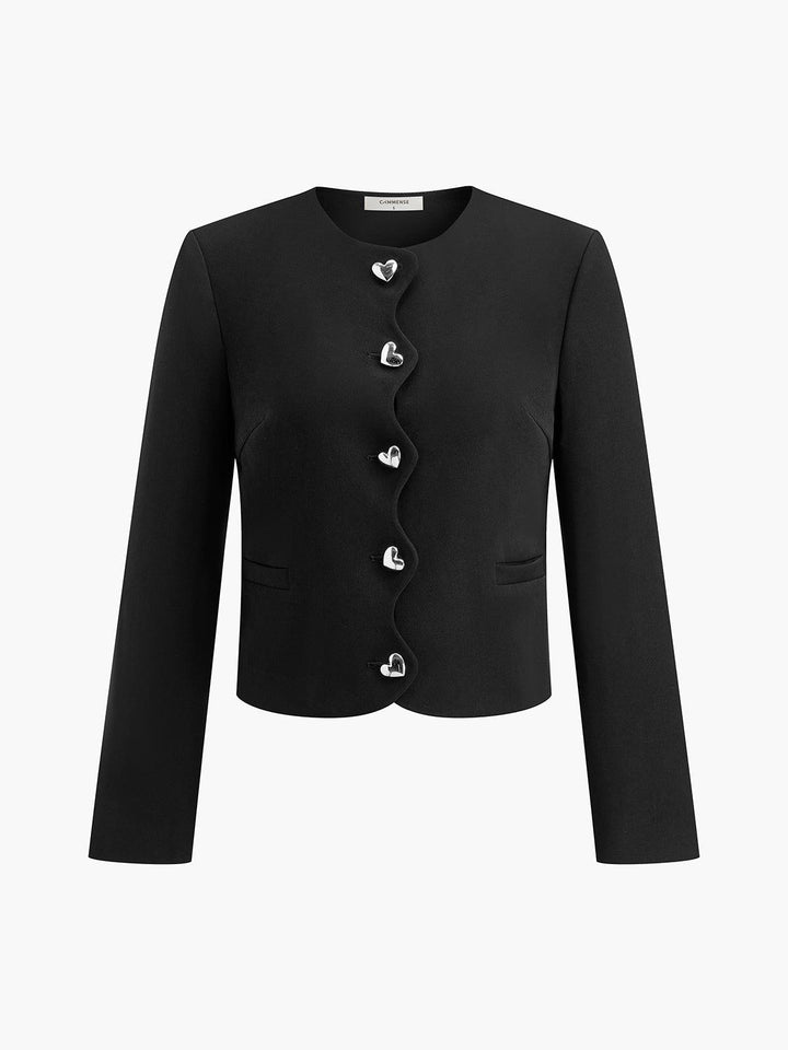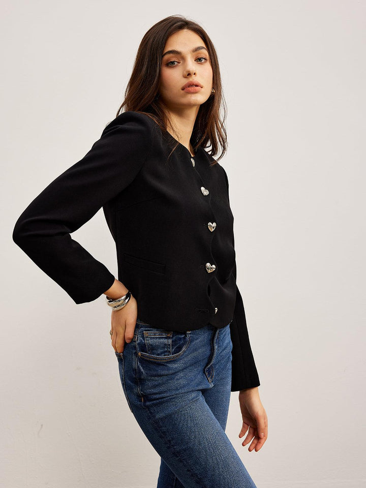 Romantik tasarımıyla öne çıkan bu siyah kısa ceket, zarif kalp düğme detaylarıyla şıklığı tamamlıyor. Günlük kombinlerinize modern ve zarif bir dokunuş katacak özel bir parça!