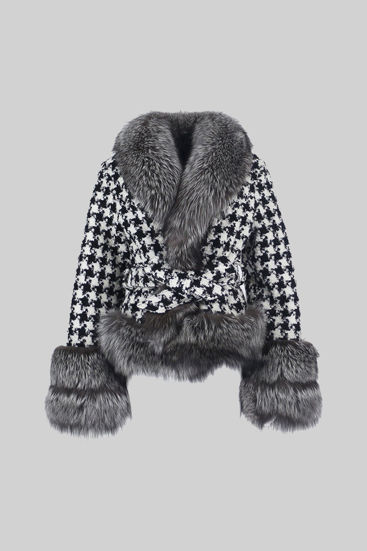 Modern çizgiler ile klasik detayları buluşturan bu kazayağı desenli yün palto, zarif kürk dokunuşlarıyla öne çıkar. Bel kısmındaki ayarlanabilir kuşak, vücuda oturan ve feminen bir siluet sunarken, yan cepler tasarıma fonksiyonel bir özellik kazandırır. Yüksek kalite kumaşı sayesinde hem konforlu hem de uzun ömürlü kullanım imkânı sağlar.