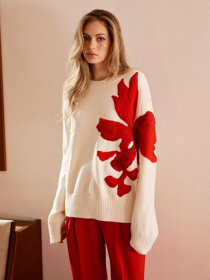 Canlı kırmızı çiçek deseni ve rahat kesimiyle dikkat çeken bu oversize triko kazak, stilinize enerjik bir dokunuş katıyor. Hem günlük hem de casual kombinler için mükemmel bir tercih!