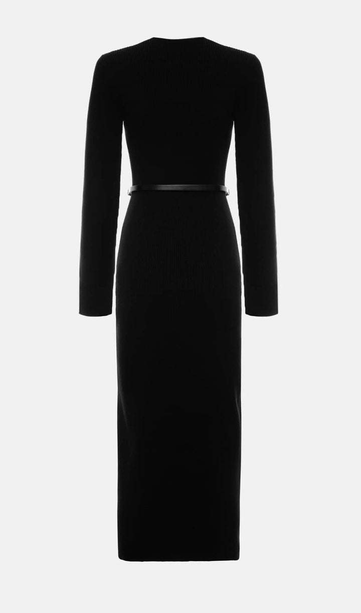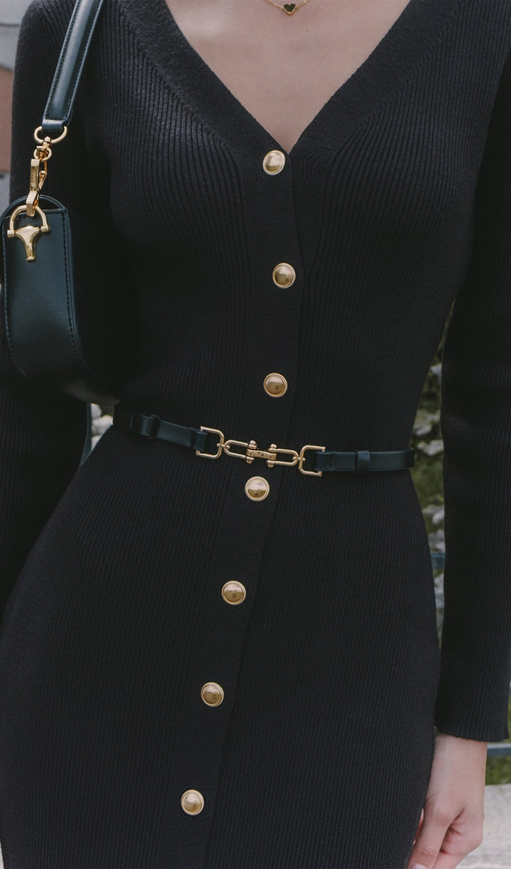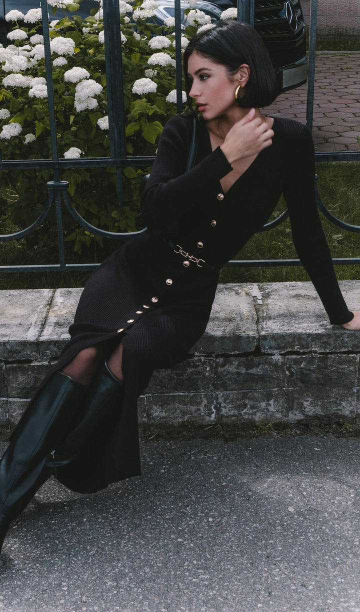Zarif, sofistike ve güçlü bir duruş için siyah knit midi elbise gardırobunuzun vazgeçilmezi olacak. V yaka detayı, altın renk düğmeler ve ince bel kemeriyle feminen hatları ön plana çıkarırken, esnek kumaşıyla gün boyu konfor sağlar. Hem gündüz hem de akşam kombinleri için mükemmel bir seçim.