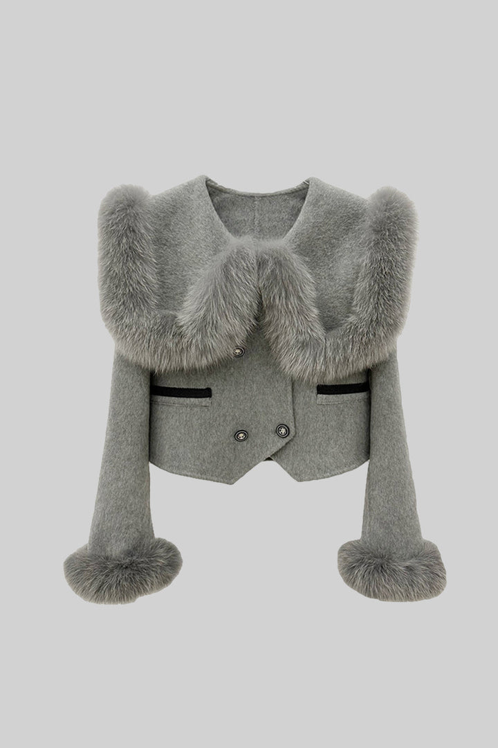 Modern ve şık görünümüyle öne çıkan bu gri kısa ceket, çift düğmeli ön kapaması ve zarif kürk yaka detayıyla sofistike bir stil sunar. Kürk manşetler ve ceplerdeki kontrast siyah biyeler tasarıma özgün bir karakter kazandırırken, kısa kesimiyle çağdaş bir siluet oluşturur. Şıklık ve detaylarıyla gardırobunuzun gözde parçalarından biri olmaya adaydır.