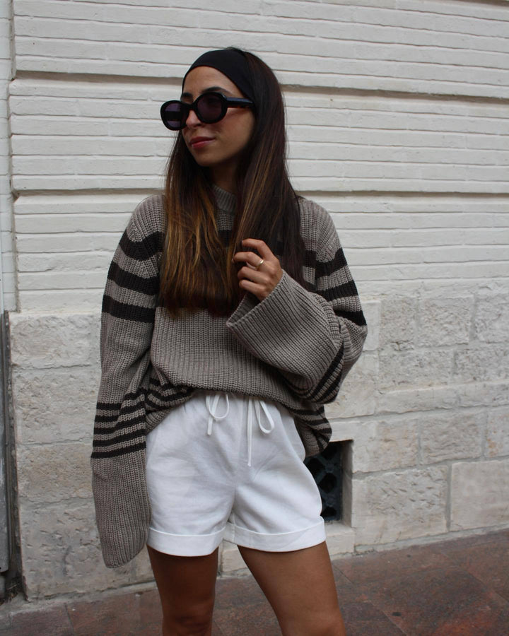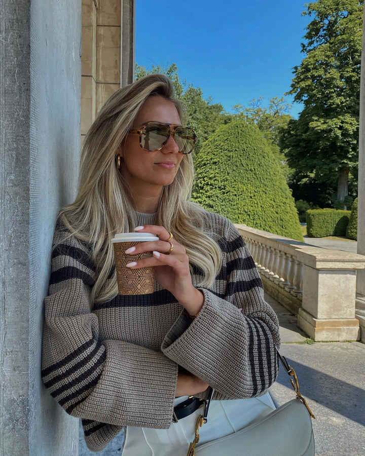 Kahverengi Çizgili Oversize Triko Kazak