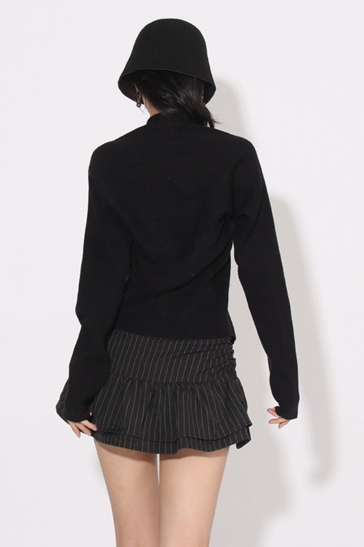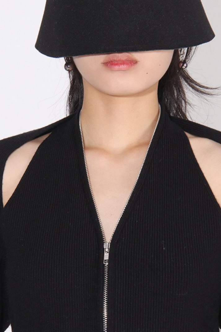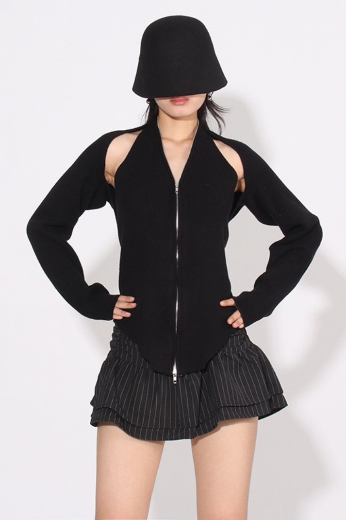 Klasik hırka formunu modern bir dokunuşla yeniden yorumlayan bu parça, cut-out omuz detaylarıyla sıradanlıktan uzaklaşıyor. Fermuarlı yapısı sayesinde farklı şekillerde kullanılabilir; ister tam kapalı, ister yarı açık bir stil ile cesur kombinlere uyum sağlar. Mini etekler ya da yüksek bel pantolonlarla kolayca eşleştirilebilir.