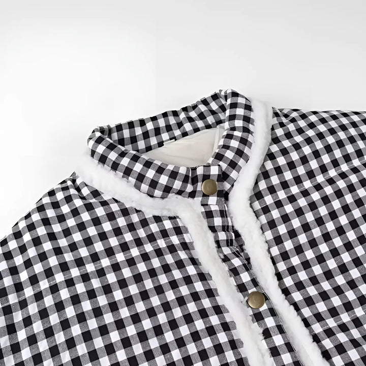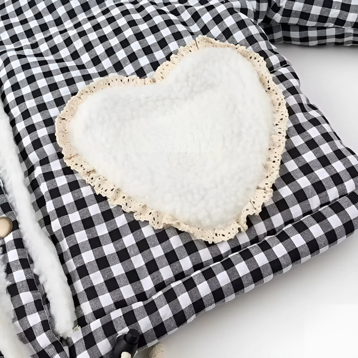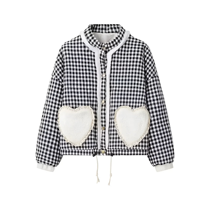 Klasik siyah-beyaz kare deseniyle zamansız bir şıklık sunan bu ceket, ön kısmındaki peluş kalp ceplerle playful (oyuncu) bir hava katıyor. Vintage detaylar modern çizgilerle birleşirken, dantel kenar süslemeleri feminen bir dokunuş sağlıyor. Hem şehir stiline hem de retro kombinlere uyumlu bir parça.