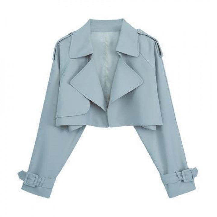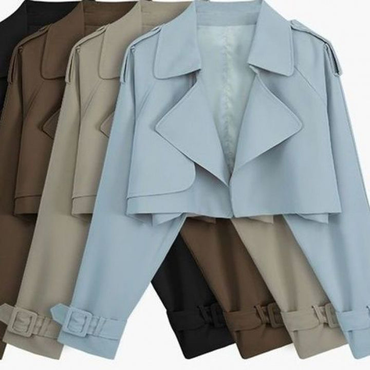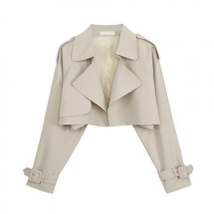 Kısa form trençkot, geniş yaka ve bilek kemer detaylarıyla modern ve zarif bir görünüm sağlar.