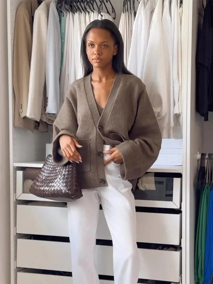 Temiz, nötr beyaz tonlu bu büyük boy örgü hırka ile rahat ve şık kalın. Rahat kesimi, derin cepleri ve gösterişli düğmeleriyle bu çok yönlü parça, her durum için konfor ve stili zahmetsizce harmanlıyor.