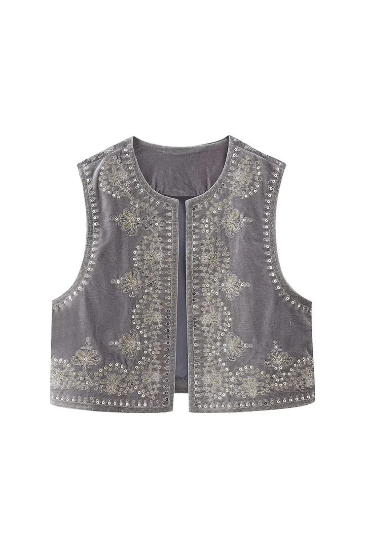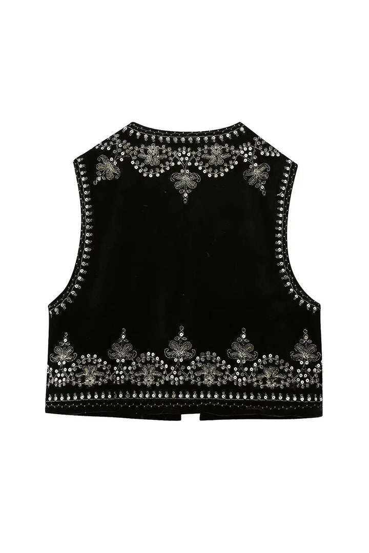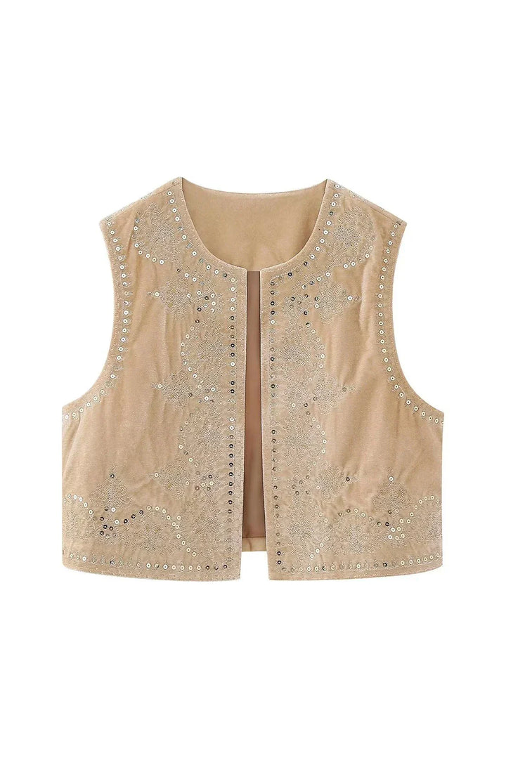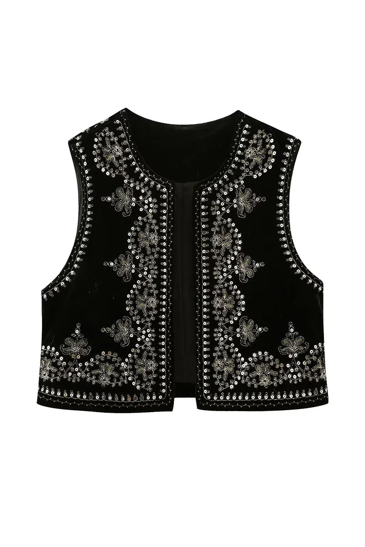 Lüks polyesterden üretilen, pullarla süslenmiş, önü açık yeleğimizle tanışın. Bu yelek, şık tasarımını öne çıkaran göz kamaştırıcı yapay elmas vurgularıyla zarafeti ve konforu birleştiriyor.