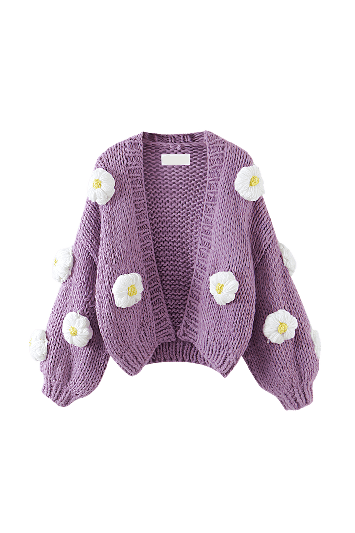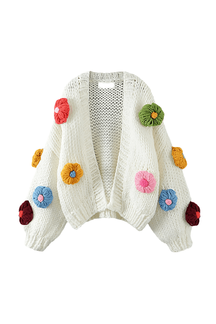 Kalın, yumuşak iplikten üretilen el örgüsü hırkamızla rahat şıklığı keşfedin. Bu hırka, büyüleyici V yakası ve narin çiçekli tığ işi detaylarıyla her türlü gündelik kombin için göze çarpan bir parçadır.