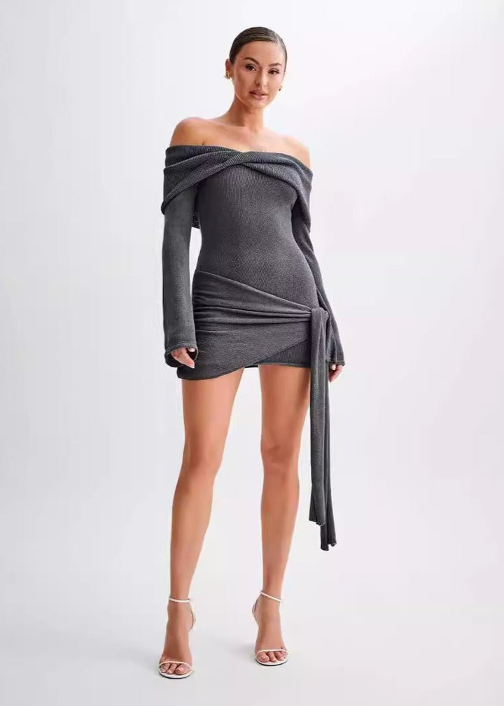 Modern şıklığı rahat dokularla buluşturan gri triko mini elbise, omuzları açık tasarımı ve bel kısmındaki kuşak detayıyla zarif bir görünüm sunar. Hem gündüz hem gece kombinlerine uyum sağlayan bu elbise, minimal çizgilerle maksimum etki yaratmak isteyenler için ideal.
