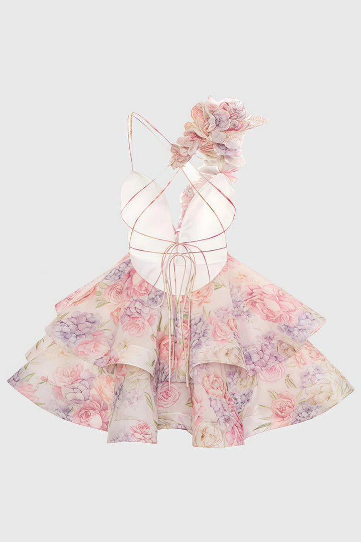 Pembe Sırtı Açık Baskılı Mini Elbise