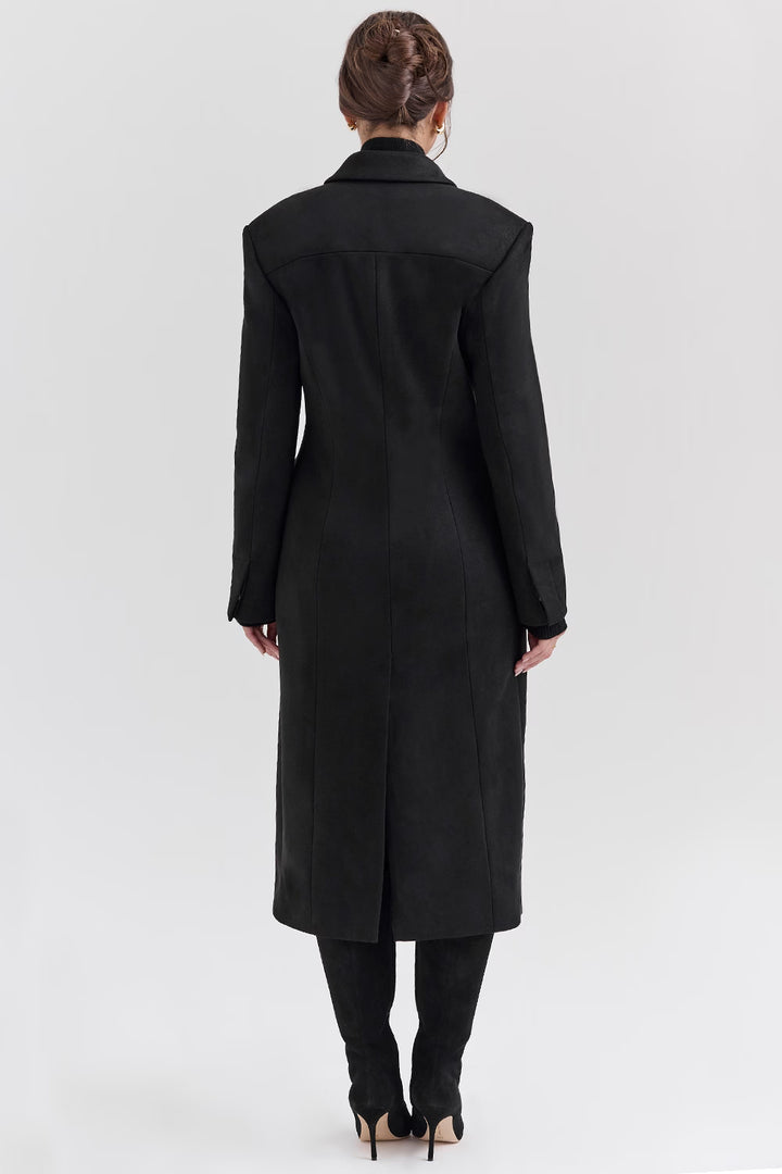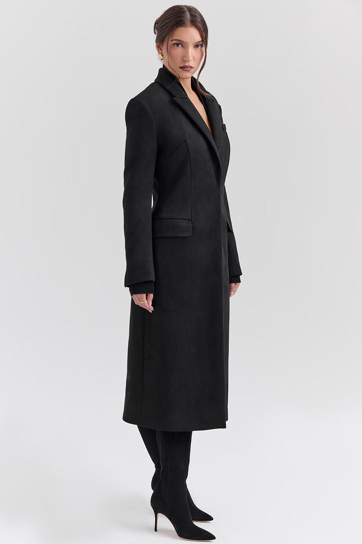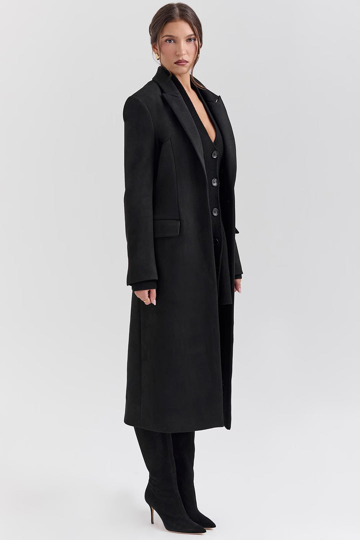 Bu uzun siyah kaban, zamansız şıklığı ve güçlü duruşu bir araya getiriyor. Minimal tasarımı ve tek düğmeli kapanışıyla sofistike bir görünüm sunarken, uzun boyu sayesinde hem şehir şıklığında hem de özel davetlerde kusursuz bir tercih oluşturur.