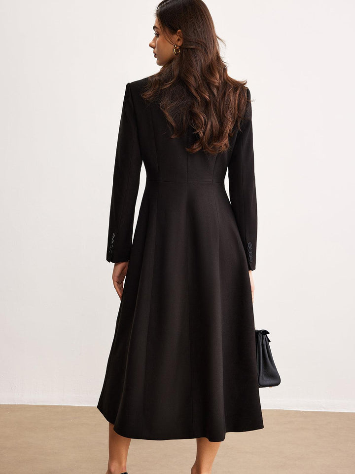 Zarif kesimi ve klasik tasarımıyla dikkat çeken siyah uzun blazer elbise, sofistike ve güçlü bir görünüm sunar. Özel davetler ve iş toplantıları için mükemmel bir seçim!
