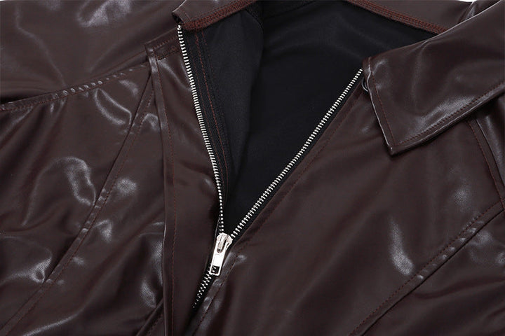 Cesur ve modern bir görünüm sunan Kahverengi Deri Crop Ceket, parlak dokusu ve kısa kesimiyle dikkat çekiyor. Fermuarlı ön tasarımı ve geniş yaka detayıyla sokak stiline güçlü bir hava katar. Jean, mini etek veya elbiselerle kombinlenerek hem gündüz hem de gece şıklığında kullanılabilir.