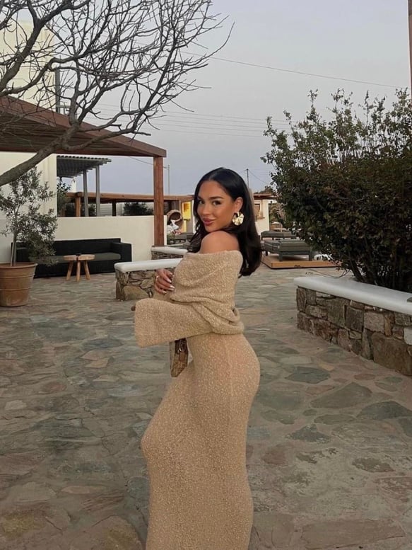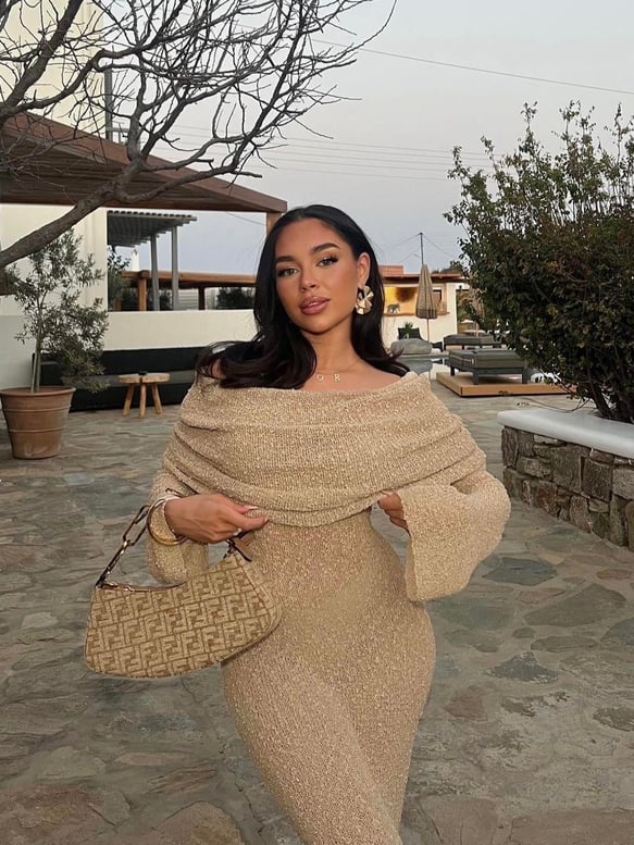 Zarif detaylarıyla öne çıkan bu gold tonlu elbise, feminen ve sofistike bir görünüm sunuyor. Omuzdan başlayan geniş drape detayı, elbiseye hem modern hem de zamansız bir dokunuş katıyor. Vücuda oturan formu sayesinde feminen silueti vurgularken, özel davetlerden akşam yemeklerine kadar stilinizi kusursuzca tamamlıyor.