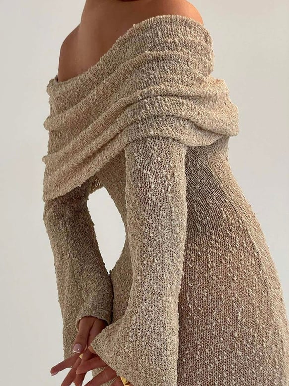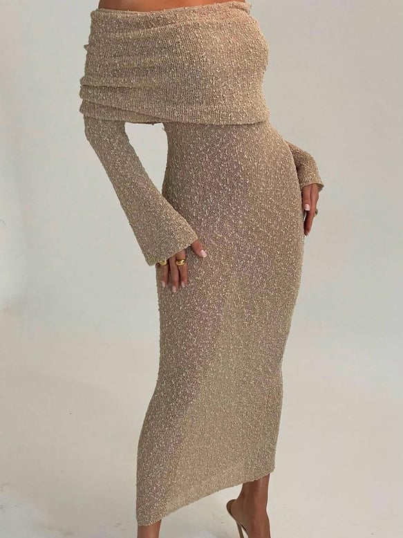 Omuz drape detaylı, vücuda oturan gold elbise – feminen silueti zarafetle ön plana çıkaran şık bir tasarım.