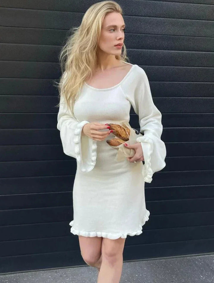 Minimalist çizgileriyle öne çıkan beyaz triko mini elbise, zarif ve sade şıklığı bir araya getiriyor. Kollarındaki geniş kesim ve fırfır detayları romantik bir dokunuş sunarken, esnek kumaşı vücudu konforlu bir şekilde sarıyor. Günlük kombinlerden davetlere kadar farklı ortamlarda rahatlıkla tercih edebileceğiniz bu parça, feminen şıklığı modern bir yorumla sunuyor.