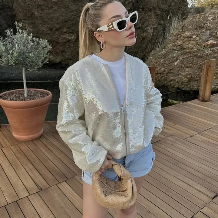 Her adımda ışıldamak isteyenler için tasarlanan payet detaylı ceket, şıklığı ve enerjiyi bir araya getiriyor. İnci beyazı zemin üzerine işlenen ışığı yansıtan payetler, günün her anında dikkat çekici bir stil yaratır. Rahat kesimiyle günlük kombinlerde kullanılabileceği gibi, özel davetlerde de iddialı bir görünüm sunar. Basic parçalarla kombinleyerek modern bir kontrast oluşturabilir ya da gece şıklığınızı tamamlamak için tercih edebilirsiniz.