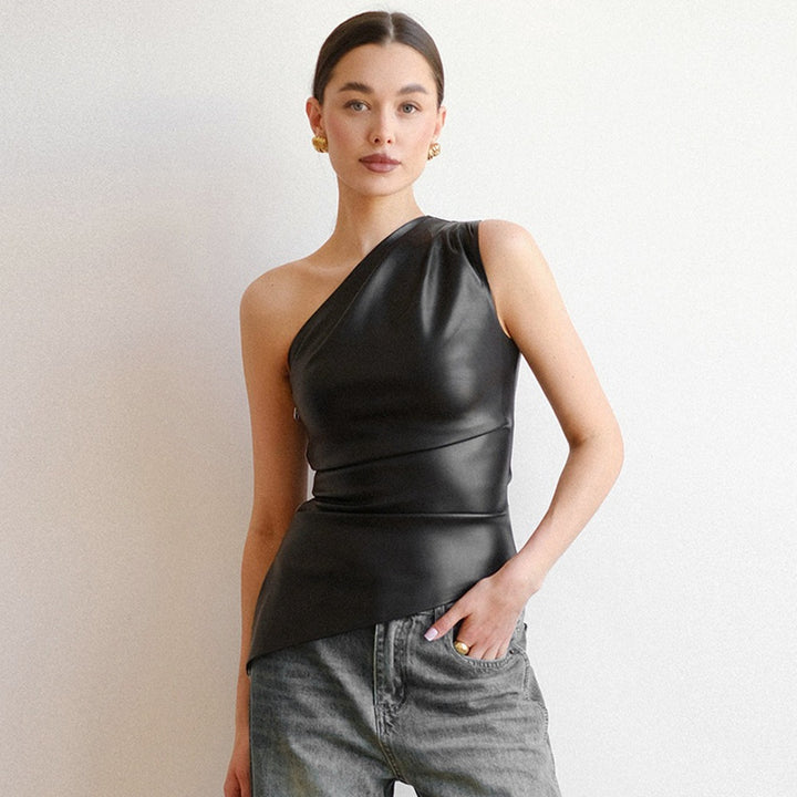 Cesur ve modern bir duruş sergileyen bu tek omuz bluz, deri görünümlü kumaşıyla sofistike bir şıklık sunar. Asimetrik kesimiyle stilinizi öne çıkarırken, vücuda oturan formu zarif bir silüet oluşturur. Gece davetleri ve özel kombinler için güçlü bir seçimdir.
