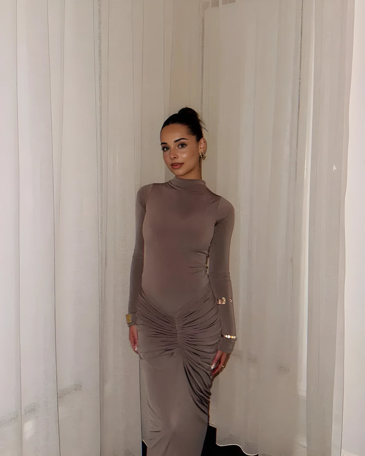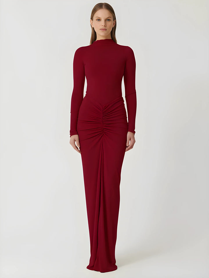 Klasik şıklığın modern yorumunu sunan bordo maxi elbise, zarif ve güçlü bir siluet yaratır. Yüksek yaka detayı ile sofistike bir hava taşırken, ön kısmındaki drapeler vücut hatlarını kusursuz şekilde vurgular. Özel davetlerde ve gecelerde dikkatleri üzerinize çekmek için ideal.