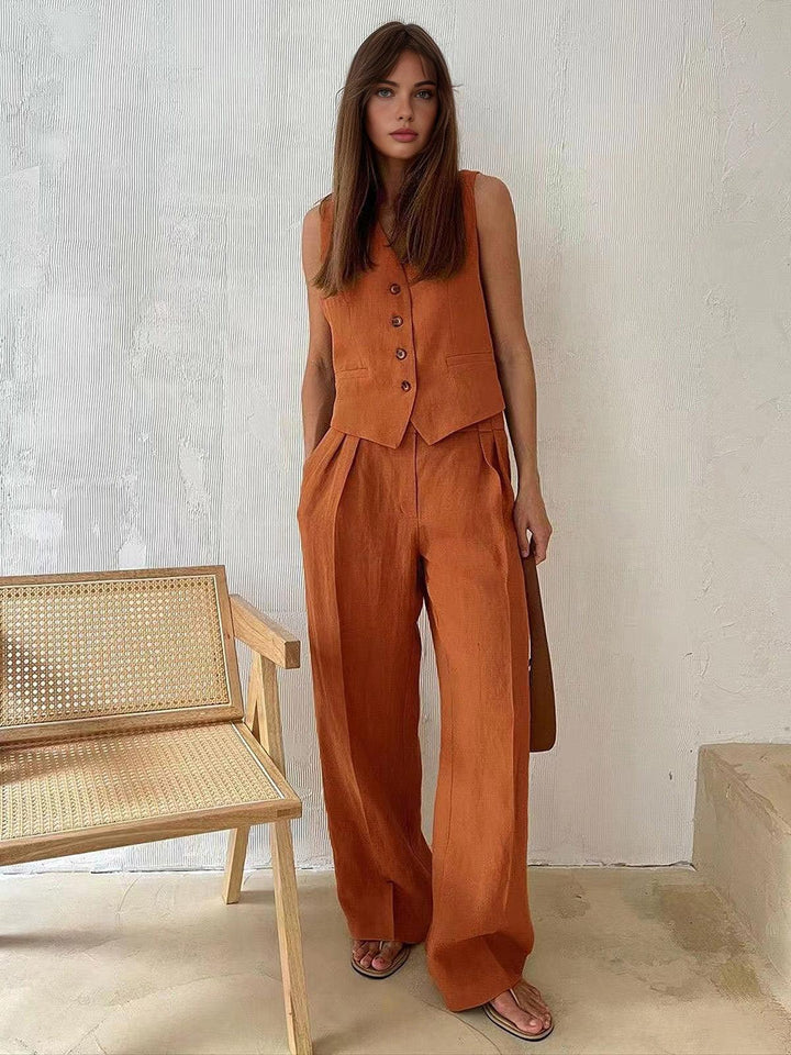 Doğal keten kumaşı ve sıcak turuncu tonuyla tasarlanmış bu yelekli takım, hem rahatlık hem de modern bir şıklık sunuyor. Günlük kullanım ve şık etkinlikler için ideal bir seçenek!